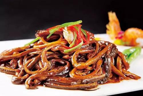 软兜长鱼,又称“软兜鳝鱼”,是淮扬菜中最负盛名的一道菜肴,淮安人厚待中外宾客最喜欢上这道“鲜嫩可口别具一格”的菜,让宾客尝鲜,赞口不绝。1949年开国第一宴中的第一道热菜就是这道号称开国第一菜的软兜长鱼。此菜选用端午前后的“笔杆青”长鱼,精心烹制。成菜后脊背乌光烁亮,软嫩异常,清鲜爽口,趁热端上;筷子一搛,微颤似跳,油亮滑爽;入口腴嫩,轻抿若化,齿颊生香。