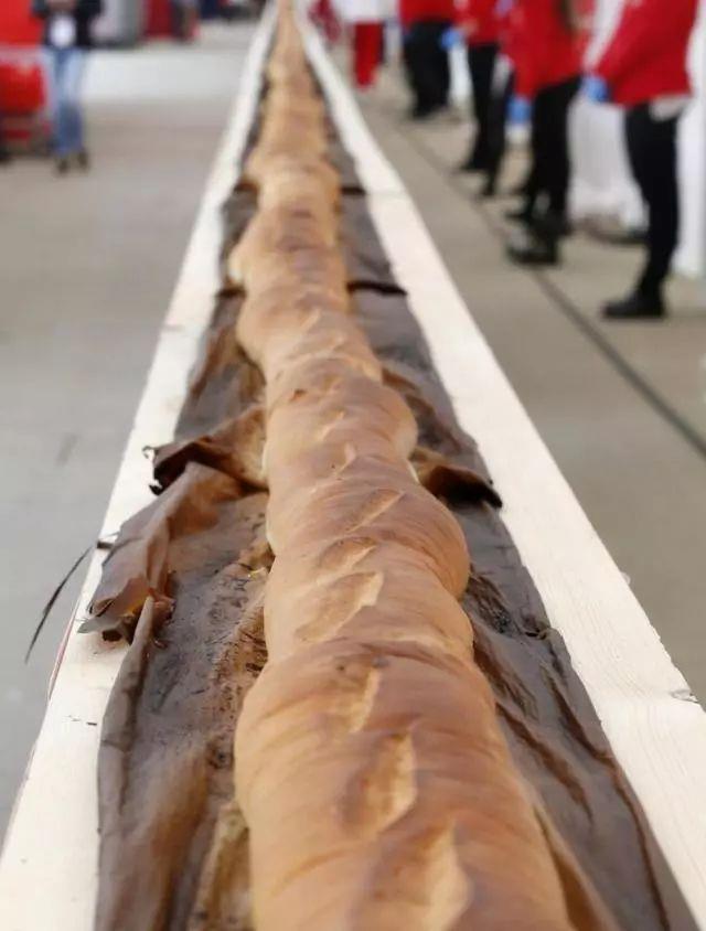 这个面包表皮松脆,内部蓬松,为了烤制这条超长法棍,面包的制作是在一个经过特殊设计、可移动的平台上完成的。面包以每小时20米的速度在平台上移动,整个面包的制作都由面包师在室外完成。