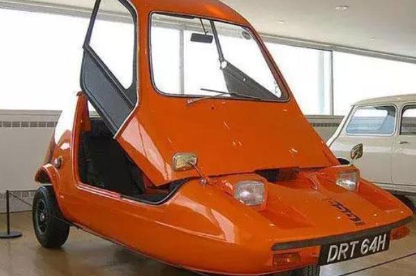 Bond bug是一款造型奇葩的三轮汽车,车窗被设计成拉帘式的,所以每次进出的姿势都很不方便。车身颜色是橙色的,质量轻,每次在后备箱中放稍微重点的东西,就会让车前轮翘起来,非常尴尬。