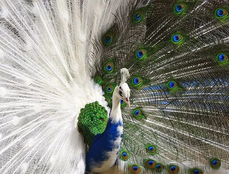 事实证明,有些动物可能是天生有一半的白化病,就像这只孔雀一样。