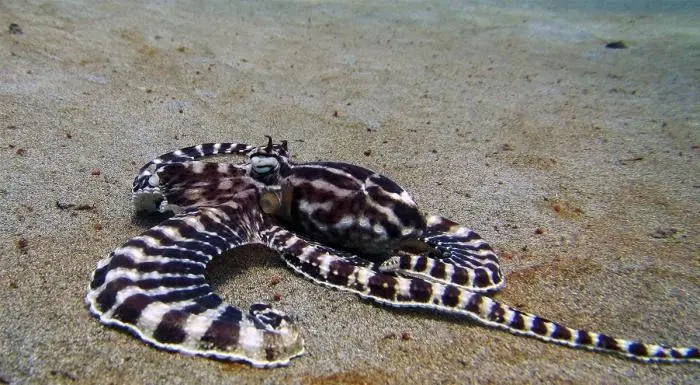 拟态章鱼:拟态章鱼模仿能力很强,可以伪装成海蛇和比目鱼等多种生物的形貌,还能很容易地变换皮肤的颜色和纹理,能让自己快速融入周遭环境。