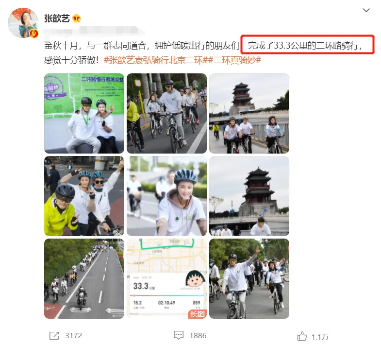 张歆艺还在微博表示,此次公益骑行活动,他们完成了33.3公里的二环路骑行。