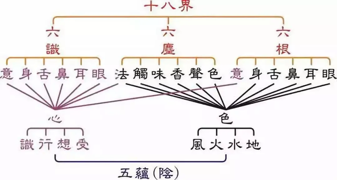 六根是属于生理学,加上六尘的物理学及六识的心理学,便是一个人的总和,六根、六尘、六识的形成,称为十八界,十八界的三大类,构成鼎足之势,相互为用,缺了一类,其他的二类也就不能存在。