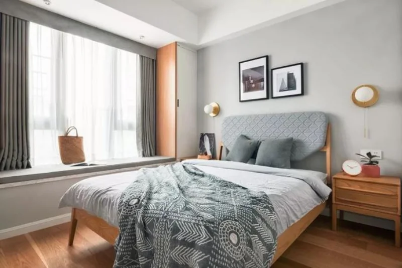 卧室延续着客厅的设计基调,灰白色和原木色的空间,点缀柔软舒适的床品,彰显出温馨舒适的休息氛围。