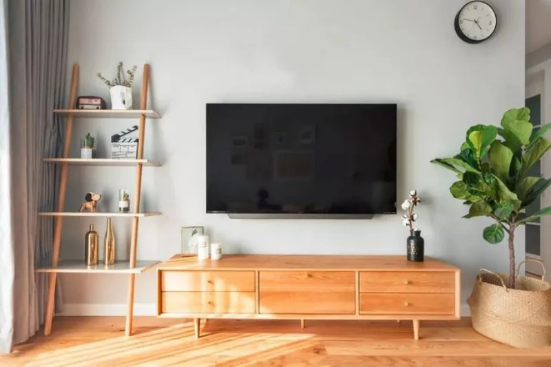 电视背景墙只是浅灰色的墙面搭配上原木色的电视柜,整体简洁又雅致。