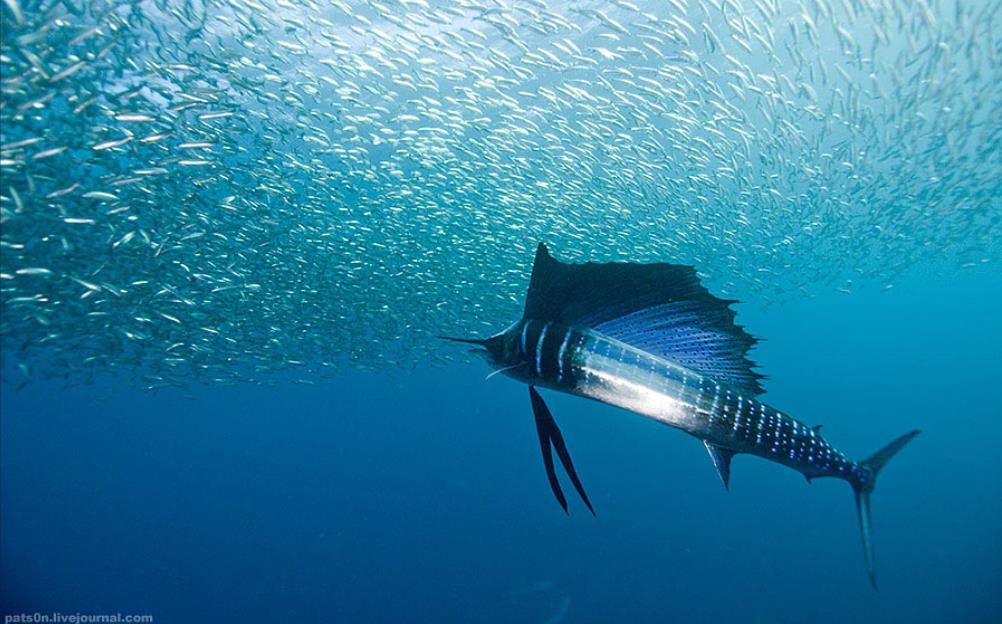 旗鱼也有尖尖的喙,可以帮助它们击晕/杀死猎物,它们在 220 磅(100 公斤)的平均身体上还拥有巨大的背鳍(这是它们名字中的“帆”的来源)。当它们想要达到高速时,它们会完全向后折叠鳍,有效地使它们长长的身体看起来像鱼雷形状。