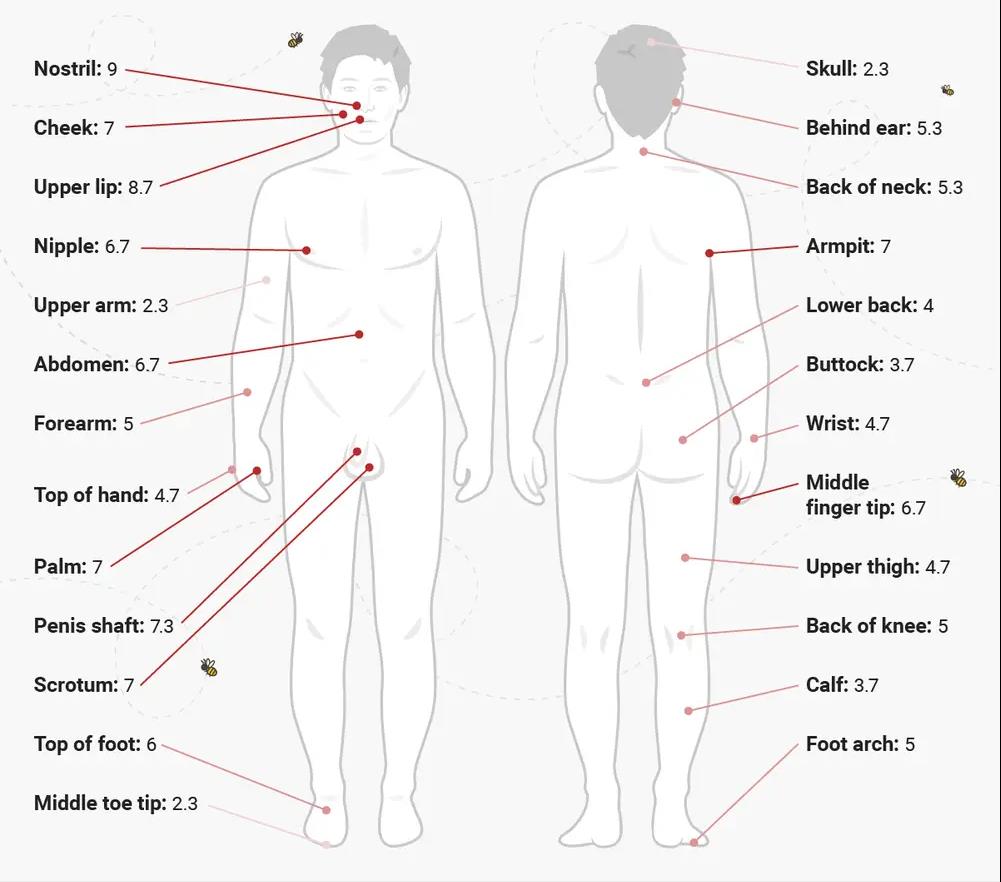 人体部位的疼痛耐性肯定是不一样的。一个叫史密斯(Michael Smith)的小哥,决定完善施密特蜇伤疼痛指数,他打算进行一项实验,以确定疼痛是否以及如何随刺痛部位而变化。