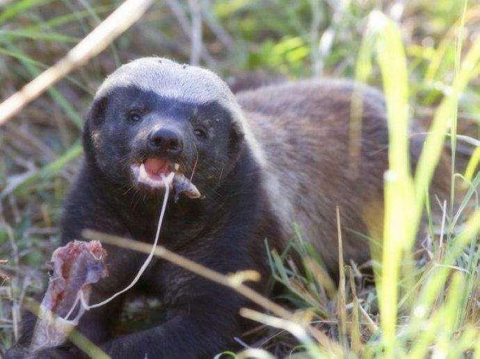 2.蜜獾会吃各种各样的食物,其中包括︰ 豪猪、 小鳄鱼、 浆果、 植物根茎、 蝎子、 蛇、 鸡蛋、 昆虫、 啮齿类动物、 鸟类、 水果、 青蛙、 人类尸体、 蜂蜜、 羊、 马等。基本上,只要可以被它们杀死的,或者碰到了动物的尸体,他们会吃了它。