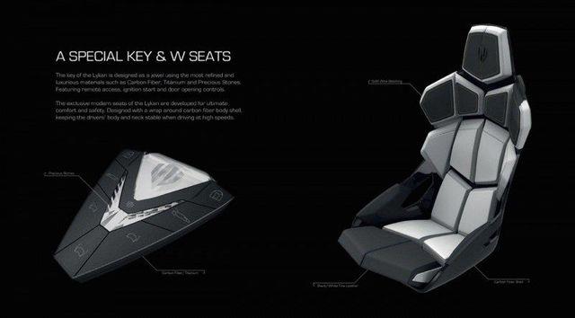 特殊设计的钥匙和战斗机座椅。全车大量运用奢华材质,车身多采用钛合金金属与碳纤维材料,座椅是用金线缝制的。连钥匙也可以高级定制,可以根据车主需求使用其他种类的宝石来搭配车的颜色。