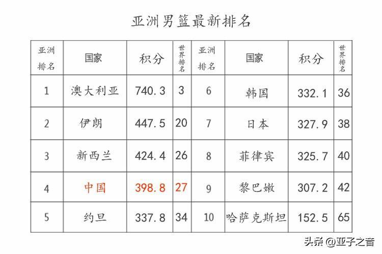 亚洲男篮排名1-5的球队为澳大利亚、伊朗、新西兰、中国、约旦。