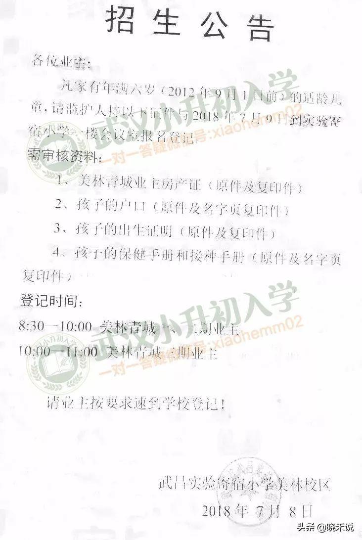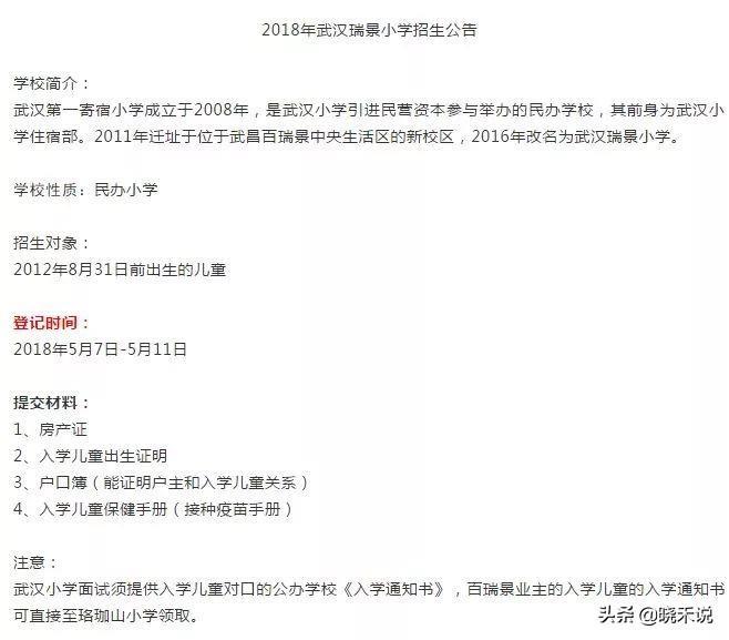 报名时间:当年5月初会发布招简,需面试。7月对口报名出通知,武汉小学面试须提供入学儿童对口的公办学校《入学通知书》,百瑞景业主的入学儿童的入学通知书可直接至珞珈山小学领取。