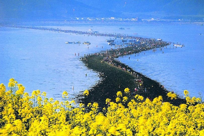 韩国有自己现代版本的摩西着名的圣经故事。每年,来自世界各地的游客涌向珍岛,目睹这种"海上离别"的自然现象。然而,它并不像它最初出现的那样神奇; 天然桥梁是由于潮汐而逐渐积聚的鹅卵石和沙子的结果。海洋总长2.8公里,退潮时宽40-60米。在节日期间举办了许多令人兴奋的展览和节目; 包括游行和文化活动。