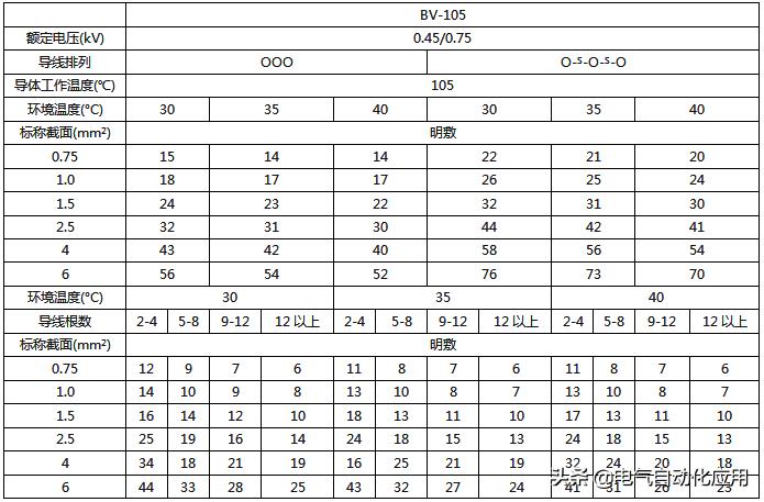 BV-105耐热聚氯乙烯绝缘电线的载流量对照表