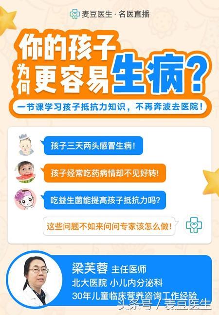 本期,麦豆医生特别邀请到了北大医院小儿内分泌科的梁芙蓉主任在本周四(5月31日)晚八点,直播讲解一些提高孩子免疫力的方法。