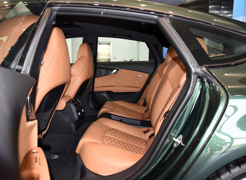奥迪RS7的中央扶手里面的无线充电板是支持快充功能的,后排体验方面,这一代的奥迪RS7在后排的空间上有明显增加,腿部空间达到了一拳,这在轿跑车型当中算是很少见的空间表现,笔者的身高为1米8,头部空间差不多有四指,将近一拳,也就是说这台奥迪RS7完全可以满足后排带人乘坐以及长途旅行的要求的,但是后排座椅虽然皮质很舒服,但是填充物在腰部位置稍微有些不太友好,长时间乘坐会有些疲惫,但是在后排的整体舒适性配置方面,四分区的空调包括后座的独立加热功能,以及两个USB充电口和12伏点烟器,这些都给后排的娱乐性以及驾乘体验方面提升了不少。