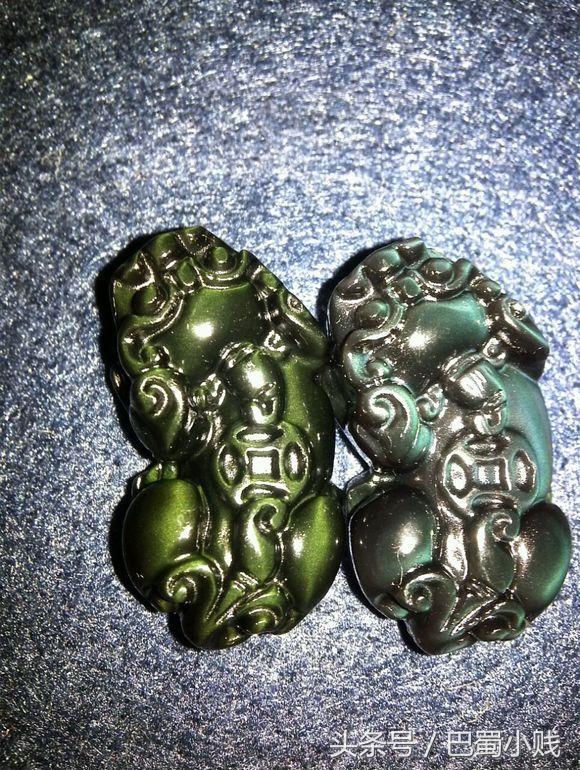 二:彩虹眼黑曜石。这种料子就比较出名了。很多人刚了解黑曜石,就是不明白彩虹眼是什么。其实彩虹眼,就是在强光照射下能看到彩色的光泽,雕件一般叫做彩虹光。这里先不多说,在下面会详细解释彩虹眼的分类。这样的料子比没有彩虹眼的价值要高一些,但是仍然,是机器压模批量生产的。请不要随便说什么雕工雕工的。没有雕工的高低,只有机器操作的好坏。