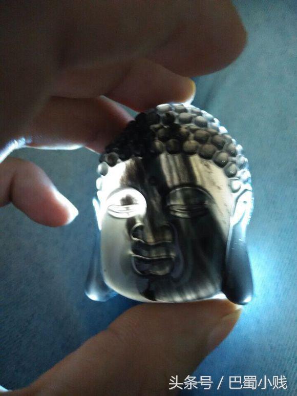 并不是所有冰种黑曜石都是很纯净的。这个佛头我个人觉得,就有很大可能是天然的冰种,常光下黑乎乎的不透,要在强光下才能看出透明。内部还有很多的杂质。