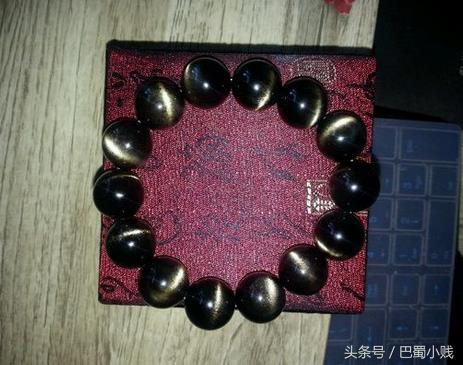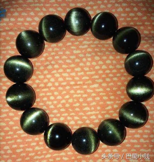 下面这两张都是猫眼金眼,比较少见,价格也比普通圆眼要贵很多,好的猫眼金曜石首先也是要底子够黑,金沙细腻均匀闪亮,花脸矿坑纹裂白点等瑕疵越少越好,其次要看眼线的位置,越细越居中越好。