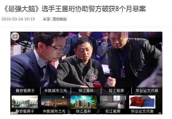 去年12月,山东警方联系了《最强大脑》选手王昱珩,希望借助他超强的观察力调查一起8个月都为破获的肇事逃逸案。在调看了模糊不清的监控录像后,王昱珩根据肇事车辆的雾灯、挡风玻璃、大灯等元素基本锁定了肇事车辆的车型等信息。3月15日,山东警方终于将嫌疑人抓获,这起案件在王昱珩的帮助下,终于在11个月后告破。