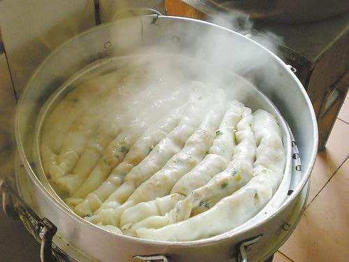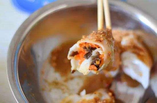 卷筒粉,顾名思义,就是卷成筒状的米粉,米浆磨好放在一边,只有顾客点单后,才开始蒸米粉,馅料品种一般有香菇、豆角、胡萝卜、头菜、碎肉等,可以自由组合。米粉刚蒸熟的同时,放入馅料后迅速卷成筒状,再淋上一层南宁特有的黄皮酱 ,加上一点花生碎,这就是南宁本地人最爱的早餐之一了。