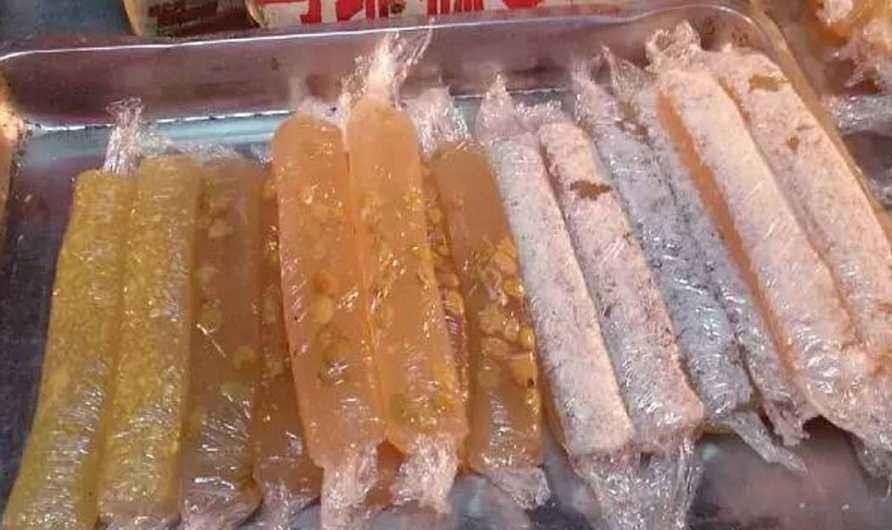 南宁马蹄糕和我们一般在超市或者早茶餐馆见到的粤式马蹄糕不一样,大家印象里的马蹄糕,是成长方形状或者棱形厚块糕点,口感比较松软。而南宁传统的马蹄糕是圆柱长条形的,有原味的,有夹水果粒的,吃的时候用剪刀将一条马蹄糕剪成小块,沾黄豆粉吃,口感比较韧弹。