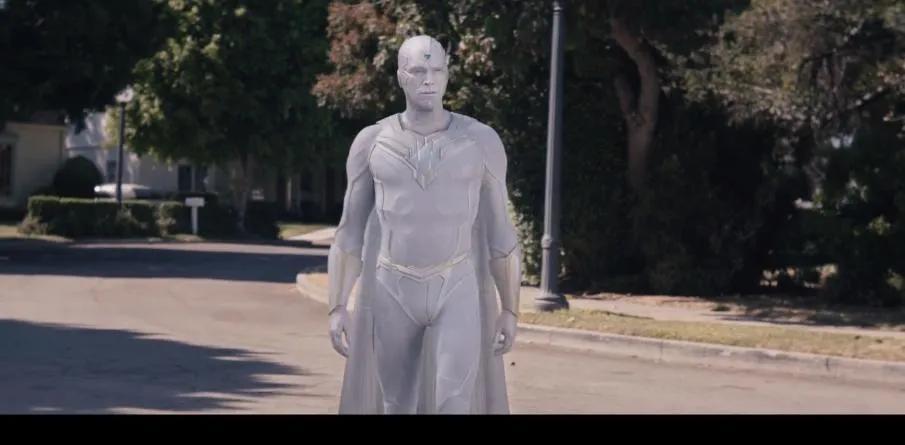 在《旺达幻视》中,天剑局利用幻视的躯体重新进行了改造激活,整个造型几乎就是一个没有“上色”的幻视造型。白幻视激活之初,没有任何感情,他被天剑局灌输的指令就是杀死幻视(这里幻视也是旺达利用混沌魔法创造出来的幻境)和旺达。
