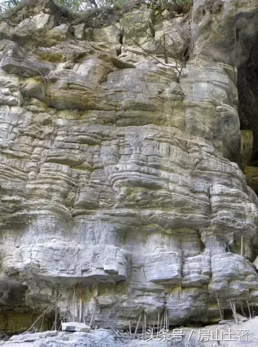 孤山寨六大奇观之石中石--在距今14-10 亿年前,这里为浅海环境,当时气候潮湿炎热,际地上的大量碳酸钙、碳酸镁被水溶解带到海洋中沉淀,形成石灰岩或白云岩,同时陆地上的二氧化硅也以胶体的形式被一团一团的带到海洋中,并随海洋里正在沉积的石灰岩和白云岩一起沉积,就形成了现在这种在岩石中包裹着的一个一个圆形、椭圆形的似爪状的石块。