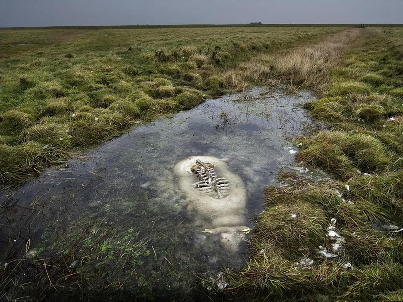 21、一只意外溺死在野外沼泽地之中的山羊,它的背部因为暴露在空气之中早已腐烂,而其他部位因为浸泡在缺氧的沼泽地中,保存完好。
