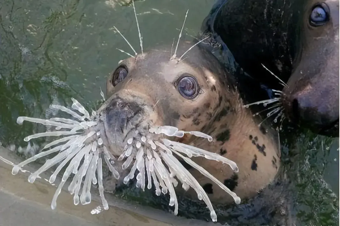 14、在寒冷的冬天,一只海豹钻出冰面呼吸新鲜空气;脸上的眉毛、胡须,却因为寒冷的天气跟水分结冰,看起来非常可爱。