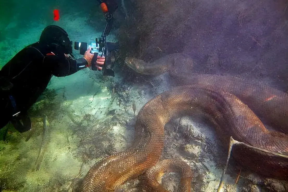 15、摄影师在亚马逊水底深处拍摄水蚺,水蚺的成年之后,是世界上体型最大的蛇类;正是因为体重过于庞大,需要生活在水中,利用水的浮力,减轻身体骨头的负担。