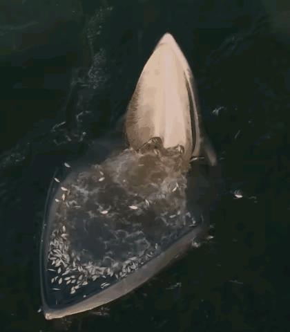 13、鲸鱼在捕食的时候,它们遇见鱼群、虾群,会张大硕大的嘴巴,混着海水,将整个鱼群一起吞下,然后再利用口腔中的鲸须过滤海水跟鱼虾。