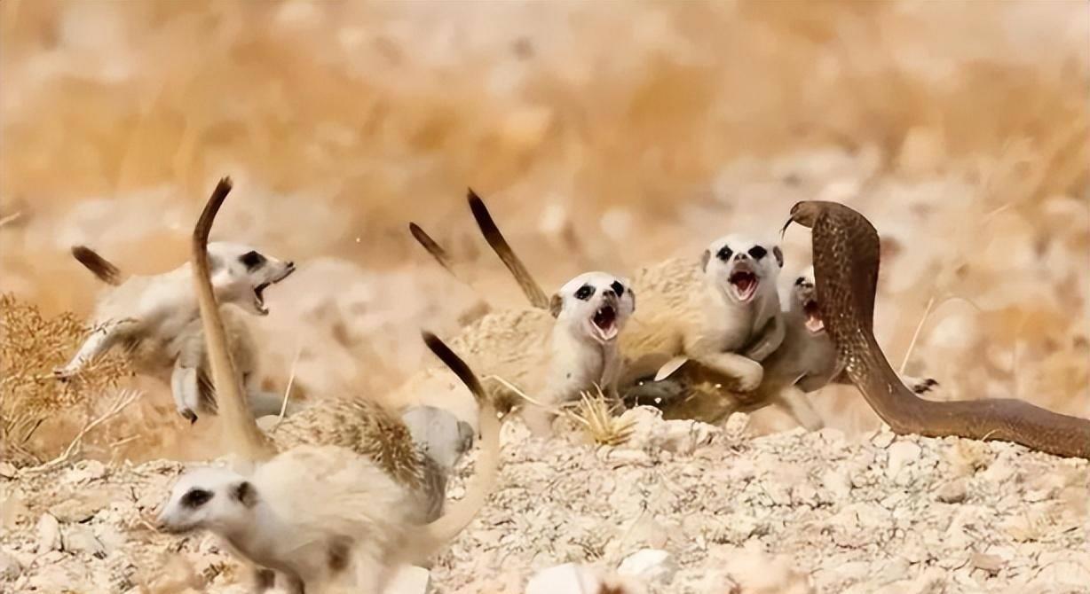 5、一群彪悍的猫鼬面对眼镜蛇的入侵,悍不畏死,一个个张牙舞爪冲向剧毒的眼镜蛇;其实猫鼬是杂食动物,平时吃吃杂草昆虫,但是也会捕猎蛇、蜥蜴等等。