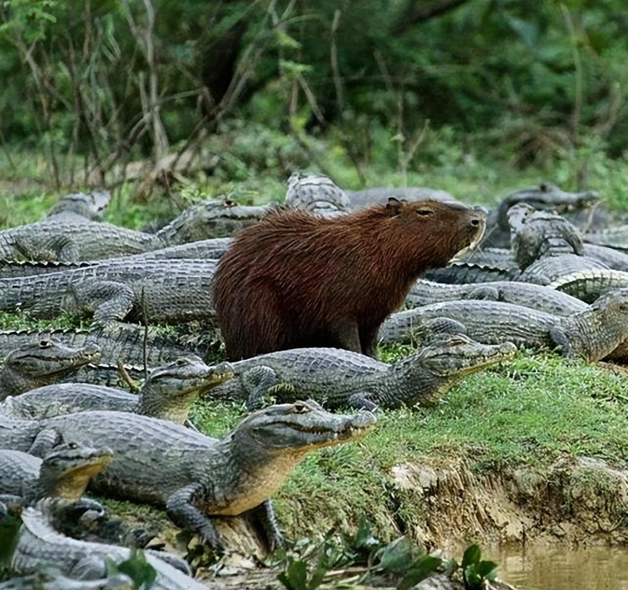 9、一只水豚跟一群鳄鱼和谐相处,光看上去大家都在晒太阳而已;可实际上,鳄鱼也会吃水豚的,所以此时此刻水豚心里也会有些许慌张。