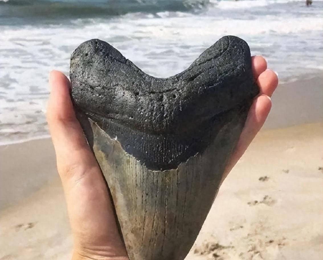 1、在美国北卡罗莱纳州的海边,网友分享捡到的史前巨齿鲨的牙齿化石,光从它的大小来看,就能知道以前体型有多夸张