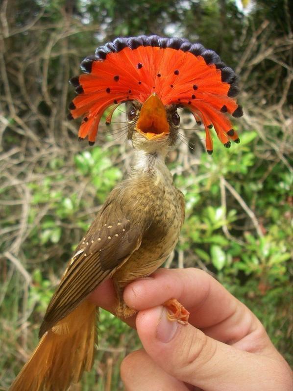 10、生活在亚马逊的皇霸鹟,其头顶上长着一个明艳的扇形冠,看着就贵气十足,像一位雨林之中的贵皇后。