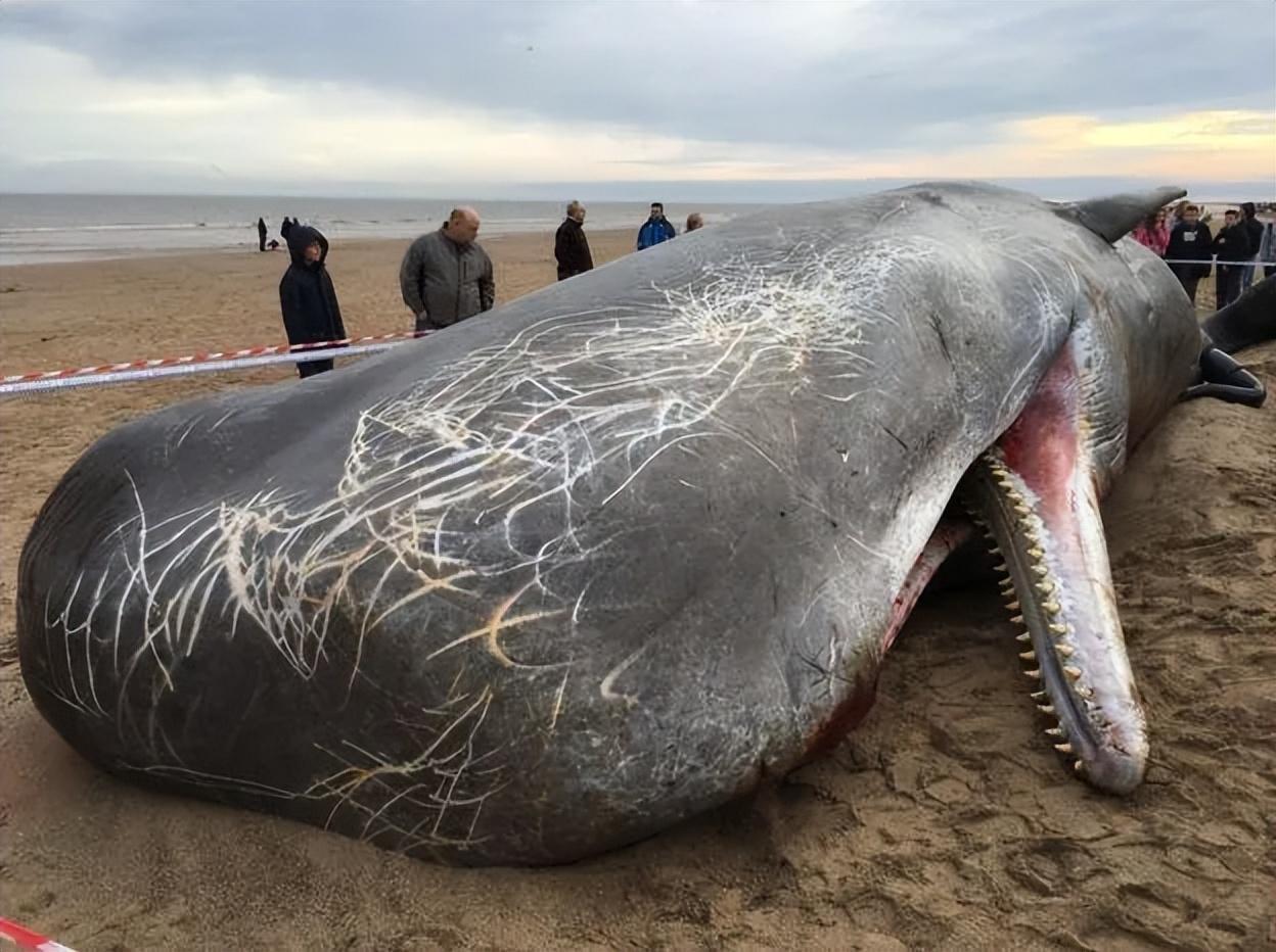 20、一条在深海之中跟巨型乌贼战斗过的抹香鲸,它搁浅在沙滩之上,从头部的痕迹来看,生前的战斗十分激烈。它们也会成群结队在深海捕食巨型乌贼。