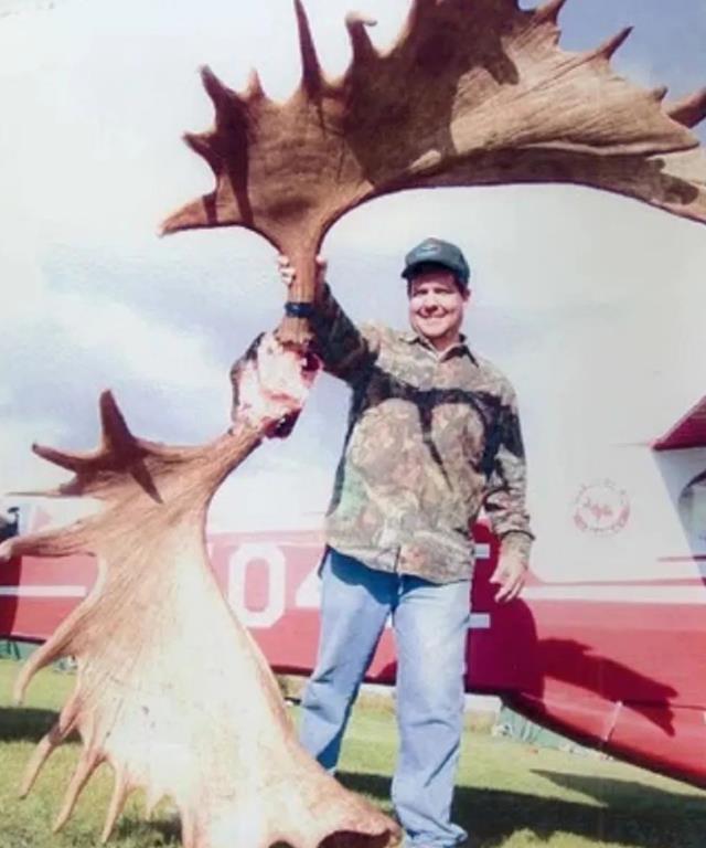25、一对成年驼鹿的鹿角跟一个成年男性的对比图,驼鹿生前体型硕大,堪比大货车,小轿车都不能跟它做比较。
