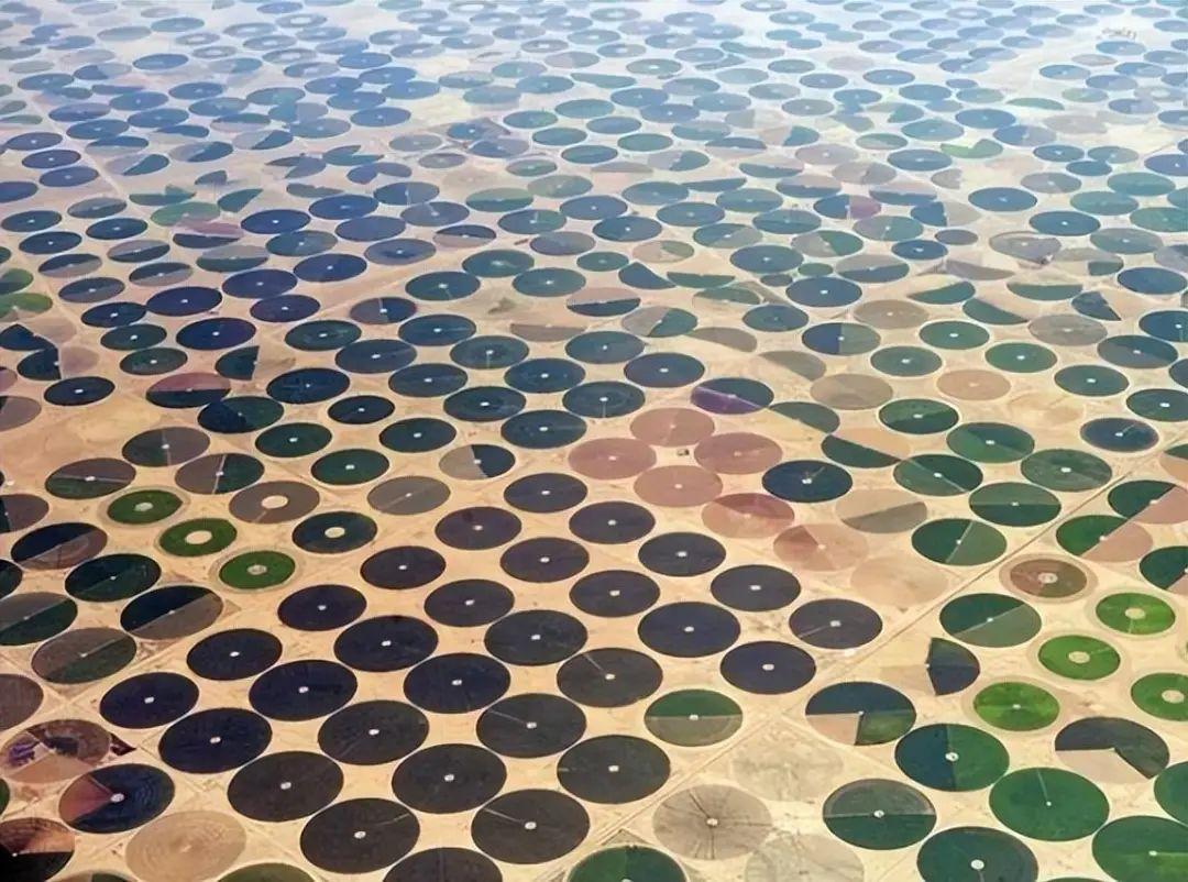 29、位于阿拉伯土地上的圆形农场,因为这里极度缺水,所以采用中心枢纽灌溉措施,在最大程度上将水资源利用到极致。