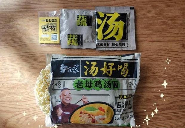 白象是老牌子的方便面了,面特别劲道,口感像手擀面,酱料包甜辣辣度适中,菜包里面有紫菜和芝麻,圆润可口,做工精细,味道可口,分量很足 ,鸡汤味道浓郁鲜香,蔬菜包量很大,是脱水蔬菜而不是晾干蔬菜,因为不用煮也可以轻易泡开,泡开后里面的菜还是爽脆的。