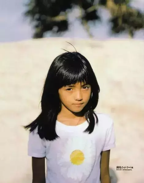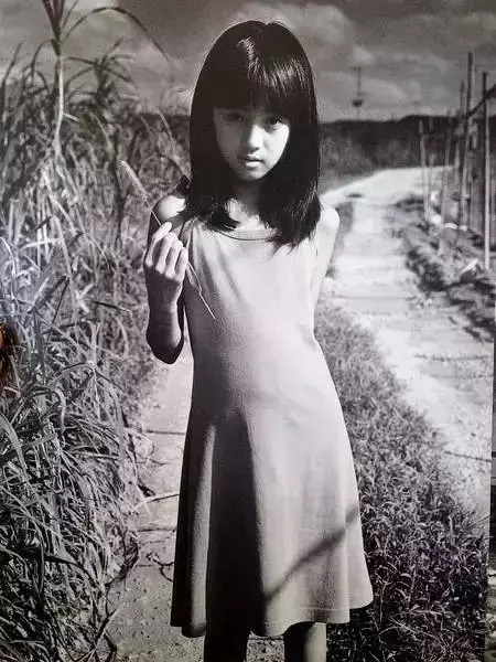 这可能是满岛光第一次认真面对镜头,努力去回应拍摄者的要求吧。最后筱山纪信拍下了一张满岛光的黑白半身照,照片上的小光妹黑发白裙、微微抿着嘴、凝视着镜头,看上去有种说不出的感伤和神秘,这张照片被放在了整部写真集的第一页。