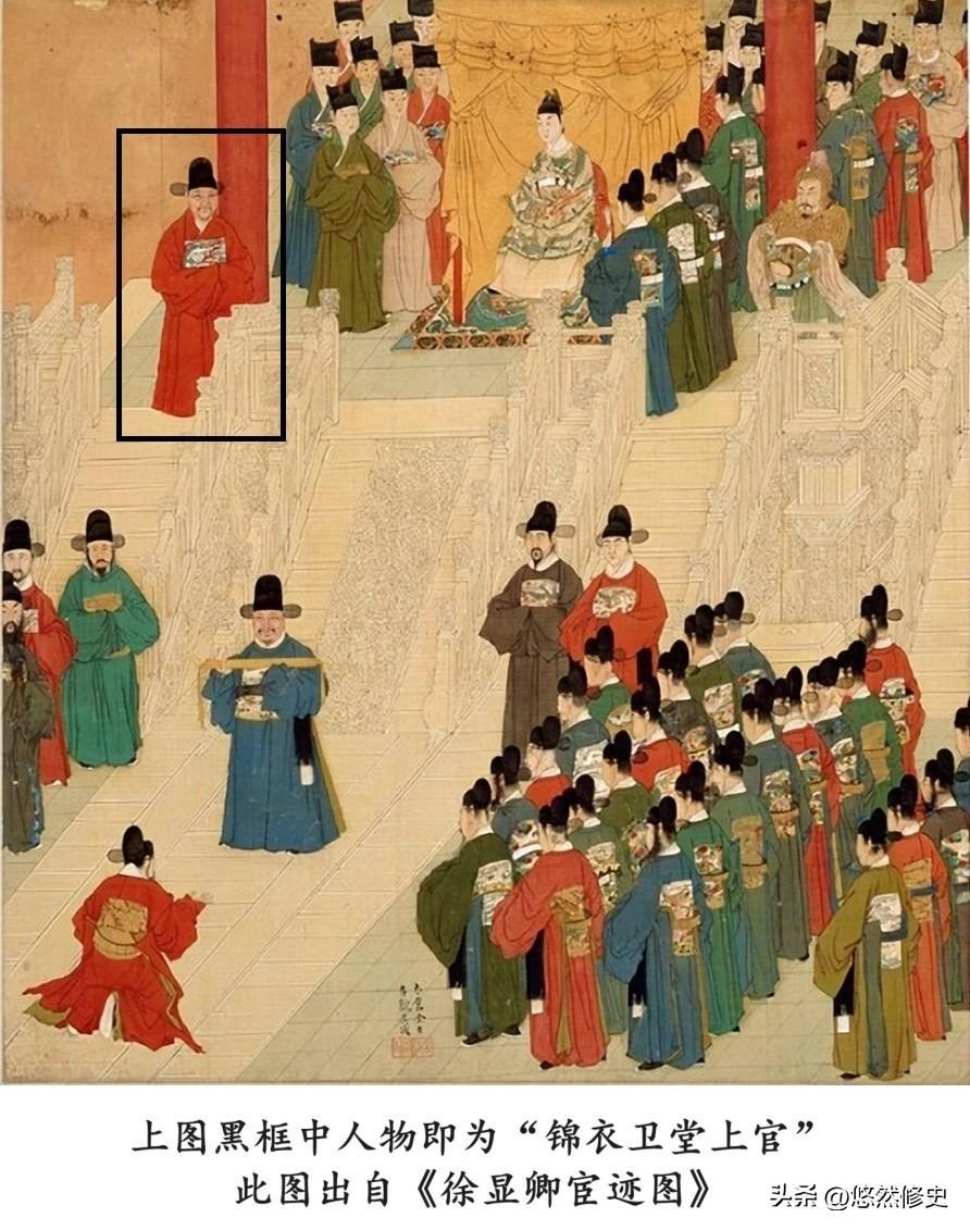 注:“锦衣卫堂上官”虽无实权,但代表着锦衣卫的最高荣耀。其职能为皇帝祭祀、朝会时身着飞鱼服、配绣春刀侍卫(轮流,每次一人)皇帝身旁,督查众官员举止言辞(可出言呵斥)。正统朝“午门血案”(实际在左顺门)中被打死的马顺,当时就在担任堂上官。