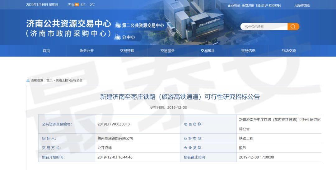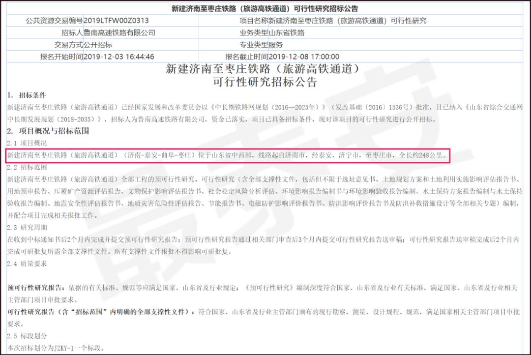 2019年12月3日,济南公共资源交易网曾发布《新建济南至枣庄铁路(旅游高铁通道)可行性研究招标公告》。