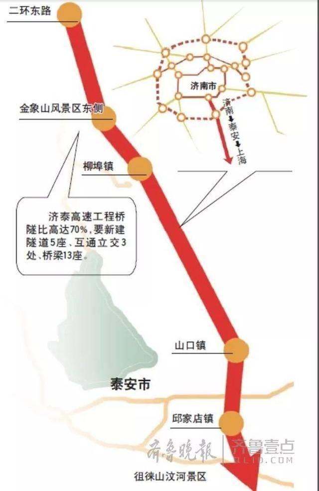 工程起于济南市绕城高速公路与济南市二环东路南延交叉处,与绕城高速设置互通连接,后向南方向展线,沿涝坡村、豆腐泉、省公安厅综合训练基地东侧、金象山风景区东侧、柳埠镇、山口镇规划区西侧布线,向南依次上跨环山路东延,国道G341,莱泰高速,辛泰铁路,穿过邱家店镇规划工业园区后,路线向东南从邱家店镇规划区东侧展线通过,跨越汶河,在徂徕镇东北部衔接泰新高速公路。