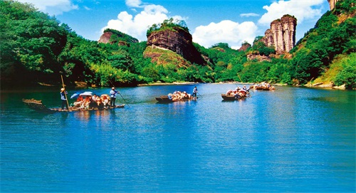 武夷山风景区位于武夷山脉的中部、福建省武夷山市境内,方圆60平方公里,盘曲山中的长约9公里的九曲溪和夹崖森列的36峰,构成一幅碧水舟山的天然美景。