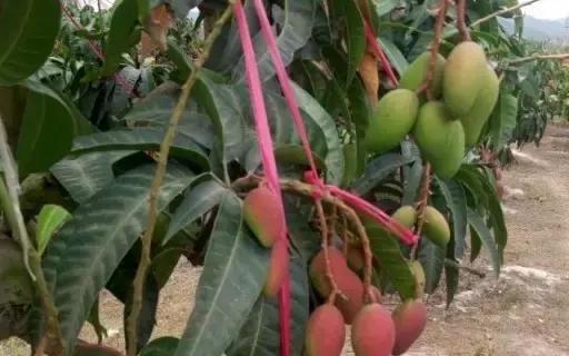 在芒果树主杆的枝头嫁接,需要改种的芒果品种,主杆给芒果生长输送营养,但并不控制芒果的品种,所以就能看到“同株异品”这样的奇特景象了。