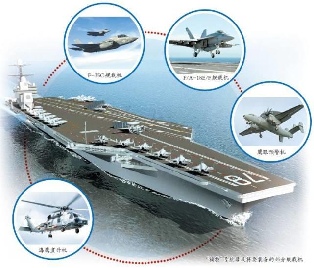 · 能搭载为数75至90架的舰载机,包括F-35C闪电II战斗机、F/A-18E/F超级大黄蜂式打击战斗机、EA-18G咆哮者式电子作战机、E-2D鹰眼早期预警机、MH-60R/S骑士鹰式多用途直升机、研发中的无人战斗航空载具(UCAV)等等。研发中的X-47B无人轰炸机已成功在布希号(CVN-77)弹射起飞,以此为基础的量产型将来会搭载于福特级上。