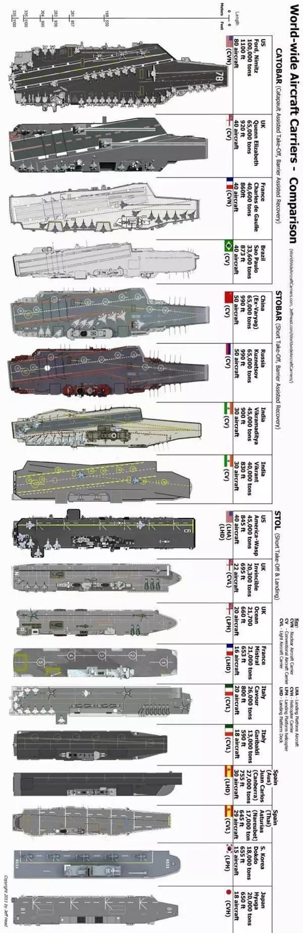 可以直观地看出,在福特级航母(最上)面前,其他各国航母都只能算“小个头”