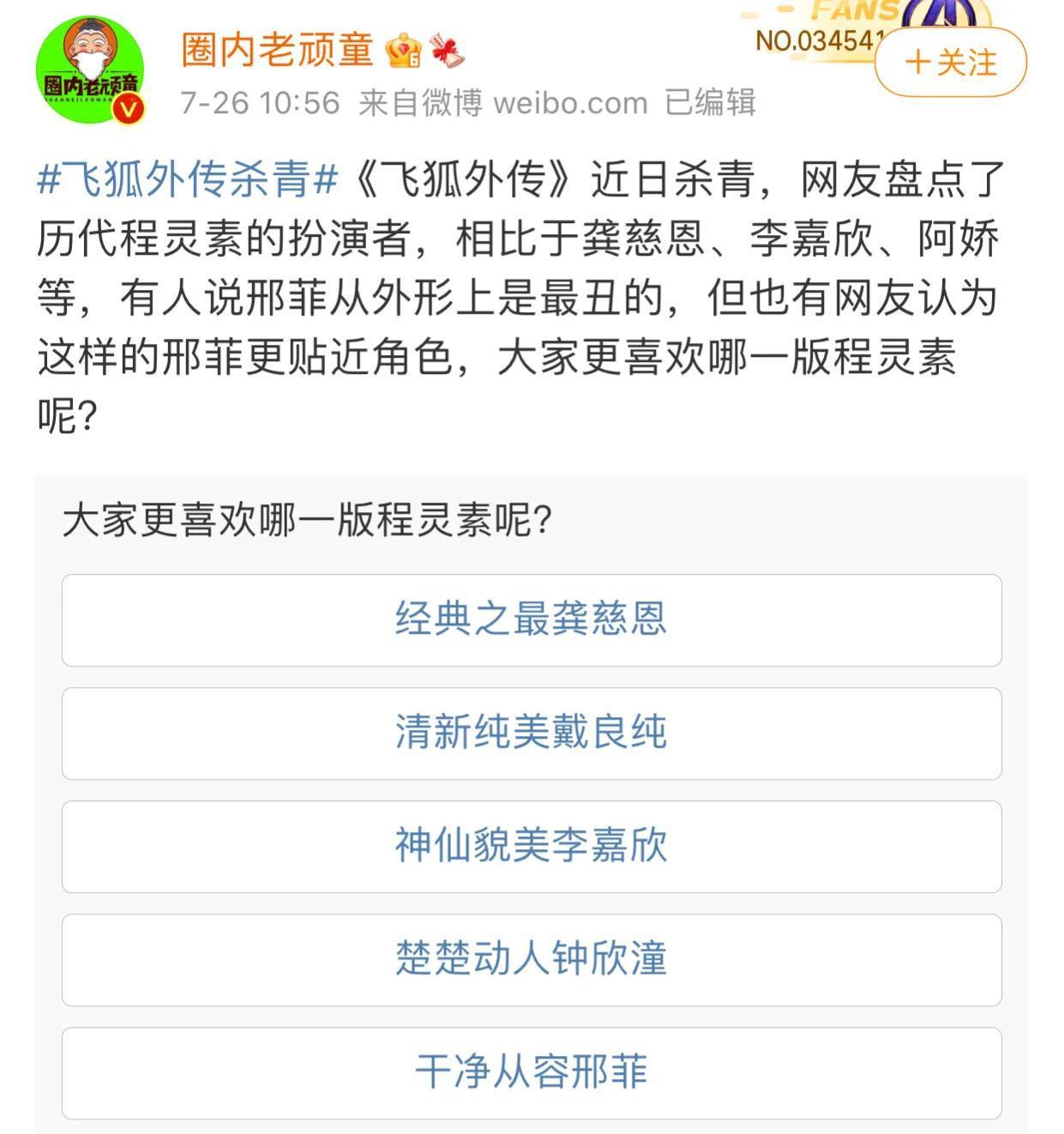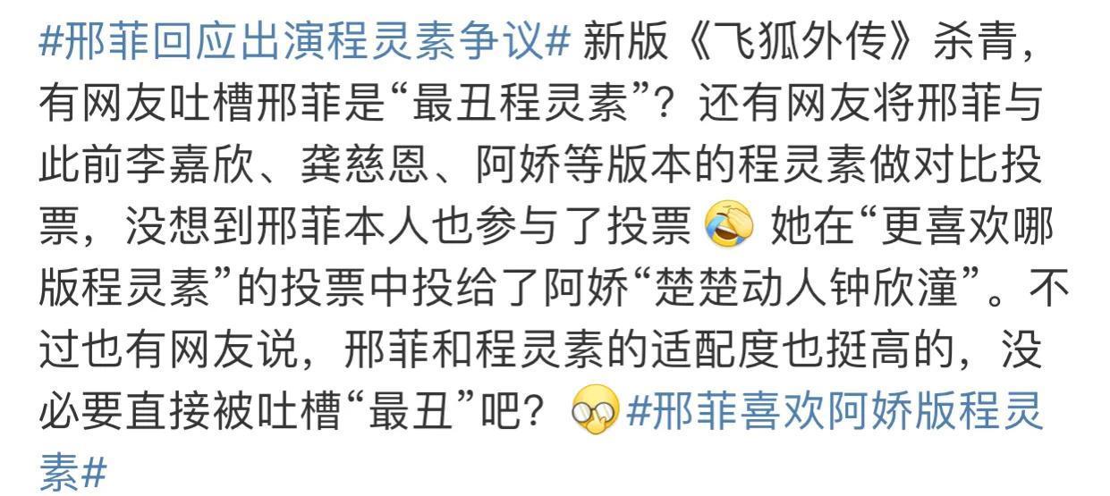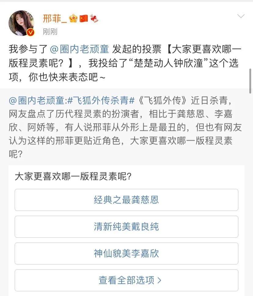 而在网友发起的投票中,对于最喜欢的程灵素这个选项,邢菲毫不犹豫地把票投给了阿娇(钟欣潼)。更是在自己的回应中称阿娇饰演的程灵素是她心中的白月光。
