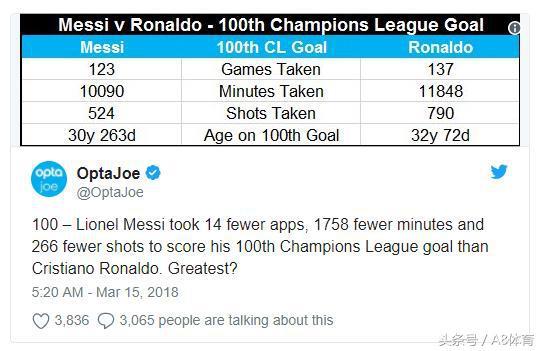 “同样是突破欧冠百球大关,梅西比C罗少用了14场比赛、少用了1758分钟比赛时间以及少用了266脚射门。所以认为梅西才是最佳?”——推特球迷留言。