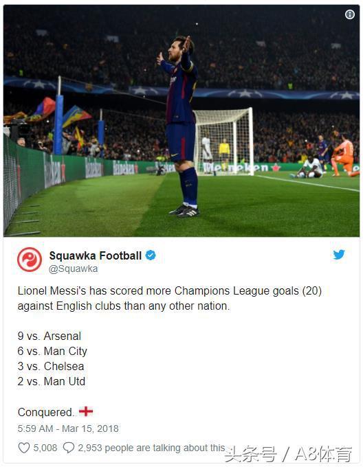说起梅西的欧冠客场进球,经常被谈到的就是梅西是如何撕碎其它联赛球队的后防线。虽然很多人都假想梅西领衔的巴萨很难击败斯托克城,因为后者的风格似乎刚好克制巴萨的风格,但事实上,梅西已经摧毁过许多其它顶级联赛的球队。梅西对苏格兰球队打进9球,12次攻破了意甲球队的大门(包括尤文图斯和AC米兰)。他还16次攻破德甲球队的大门,还记得2015年巴萨淘汰拜仁时梅西的精彩表现吗?但梅西最喜欢哪个联赛的对手呢?答案是英超联赛。梅西总共20次攻破英超球队的大门,所以如果巴萨真的遇到了斯托克城,那么也许难受的一方会是陶工。